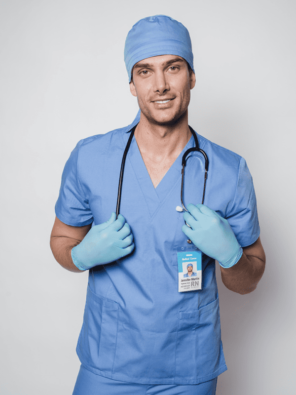 Bata sanitaria unisex, manga corta con 2 bolsillos a la altura de la cadera y un bolsillo a la altura del pecho.